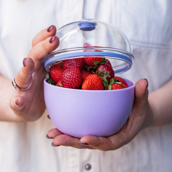 Materials: Clear plastic 50% Tritan Renew lid, silicone band and seal, PP bowl