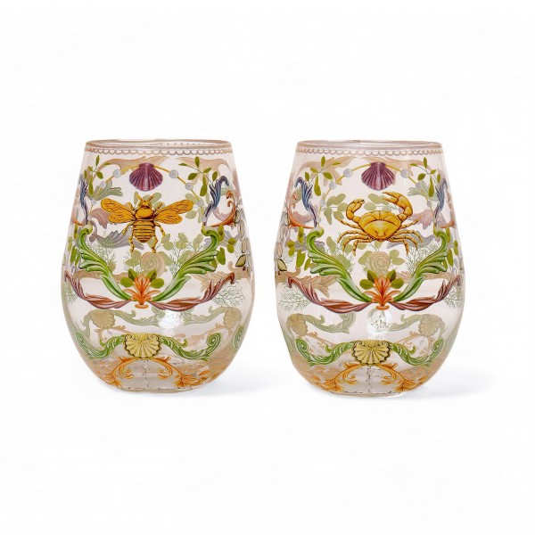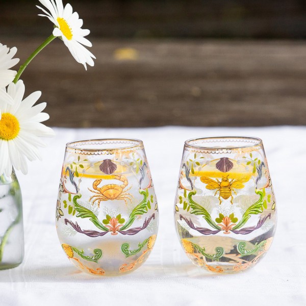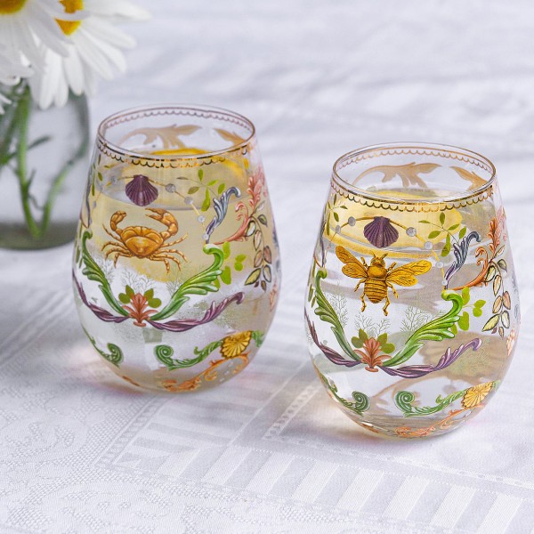 Each tumbler is a work of art in itself. The delicate glassware is adorned with Laura Ramos' captivating illustrations, depicting ornate seaweeds and decorative crab and bumble bee. The meticulous attention to detail, combined with the addition of shimmering gold foil accents, creates a truly enchanting set of glasses.