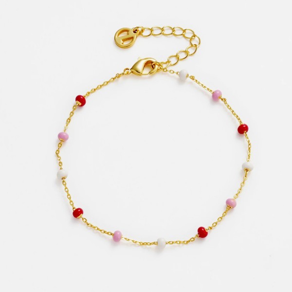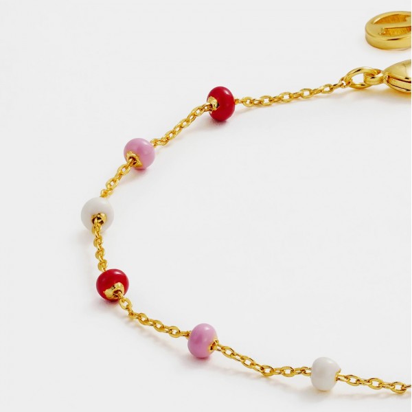 Designed to pair beautifully with the Charlotte Earrings and Necklace, the Charlotte Bracelet balances simplicity with a touch of colour. Pink enamel beads are spaced along a dainty gold chain. A versatile piece that brings subtle charm to any stack.
