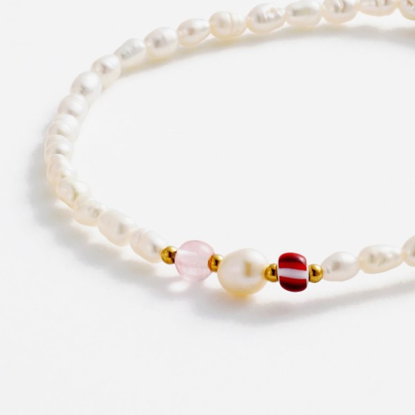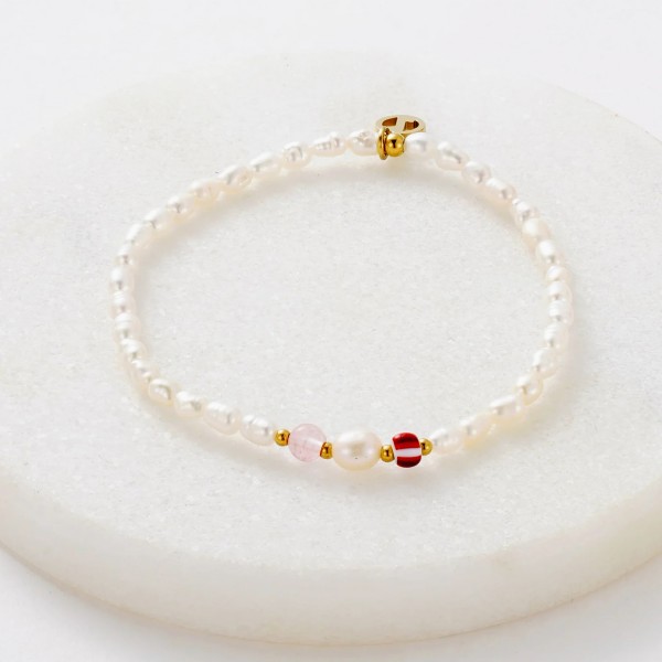 The Amber Bracelet combines timeless elegance with a modern twist. Featuring delicate freshwater pearls, a soft pink stone, and a bold red enamel bead, this piece is finished with fine gold accents for a touch of warmth. Designed to be worn solo or layered, it’s the perfect everyday statement.