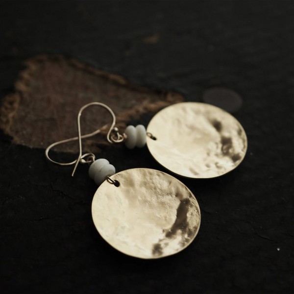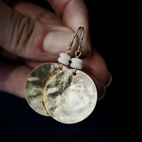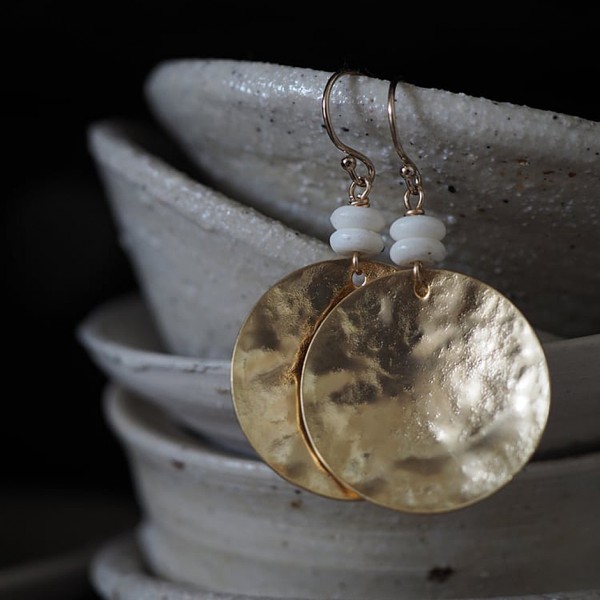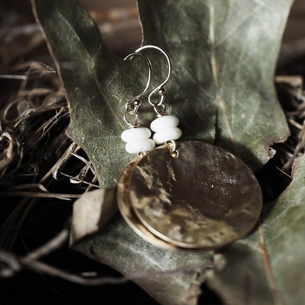 Matte gold textured brass plated discs complimented with a duo of ivory stone rondelle beads + finished with gold filled ear wires.