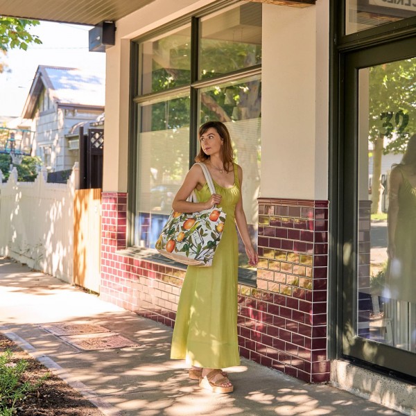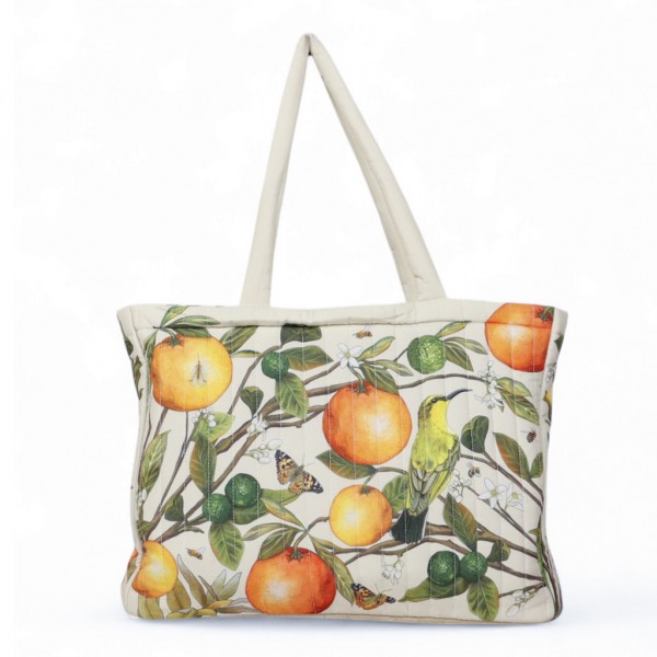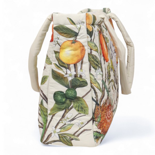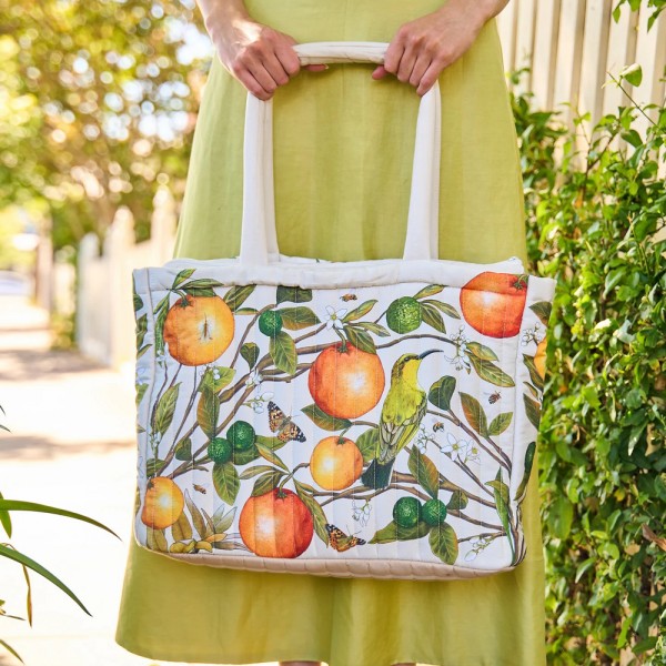 Designed for everyday ease with an artistic touch, the Quilted Comforter Bag Golden Hour is a spacious and stylish carry-all that blends practicality with standout design. Featuring detailed illustrations of native botanicals, birds and citrus motifs, this beautifully quilted bag is finished in warm, sunlit tones inspired by the golden hour glow.