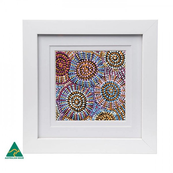 Framed print (reproduced under license) featuring artwork by Tina Martin from Warlukurlangu Artists. Established in 1985 Warlukurlangu Artists Aboriginal Corporation is a not-for-profit organisation that is 100% Aboriginal-owned by its artists from the remote desert communities of Yuendumu and Nyirripi in Central Australia.