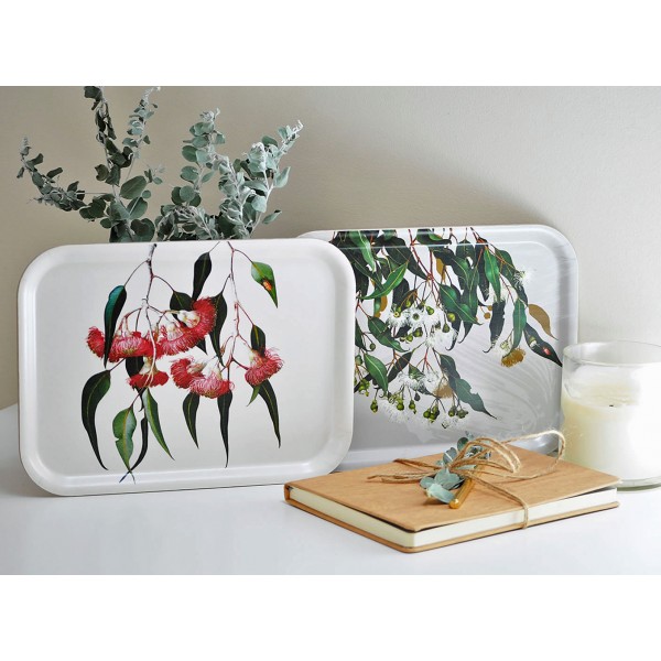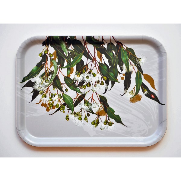 This round tray features artwork by the internationally renowned botanical Australian artist Meryl Bell. It showcases Australia’s flowering Eucalyptus Marri Gum (or commonly known as Red gum).