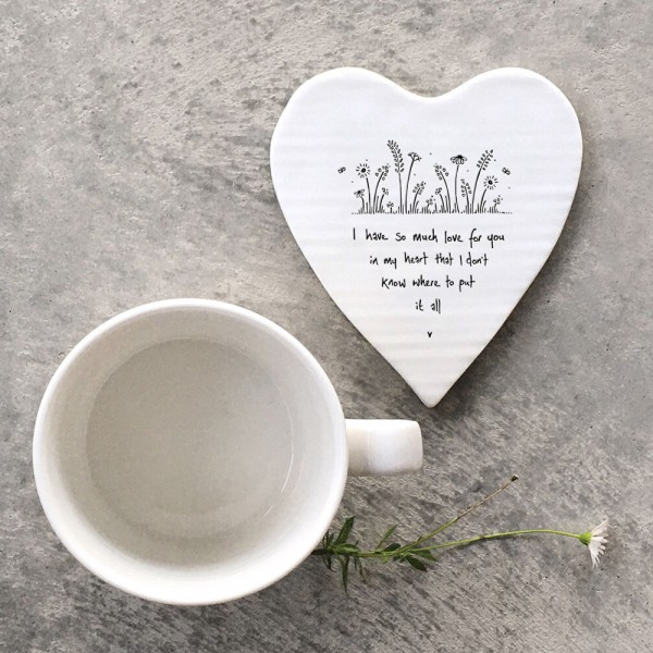 The text on the coaster reads: ‘I have so much love for you in my heart that I don’t know where to put it all’
