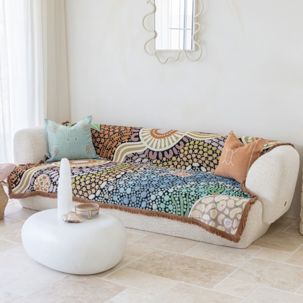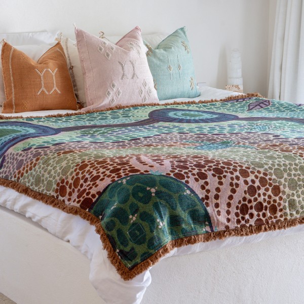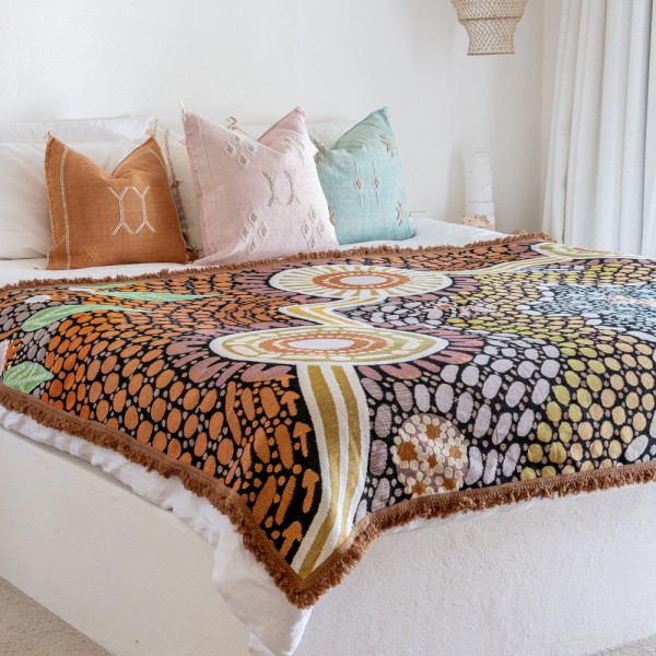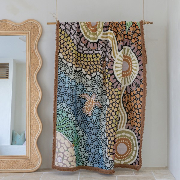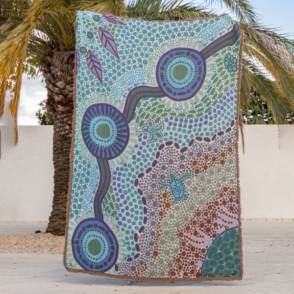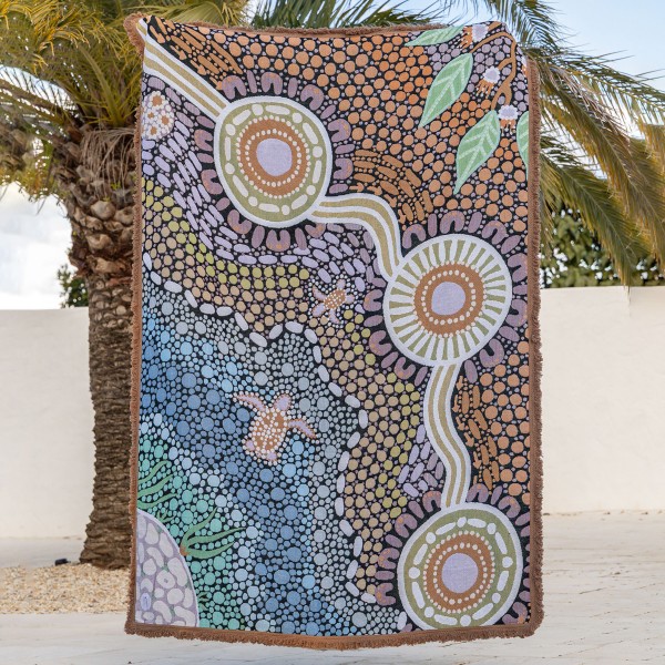 There’s so many uses for your new throw ~ They can be used as a picnic rug down the beach or park for the whole family to sit on, as a bed throw for extra warmth or to decorate or change the colour way of your bed, a lounge throw to add texture, vibrancy or warmth, a beach towel to dry yourself with after a swim in the ocean, a blanket to snuggle up in around a fire or to watch a movie, a tablecloth to decorate your dining table when you have guests around, a wall hanger to display as beautiful Indigenous tapestry and more