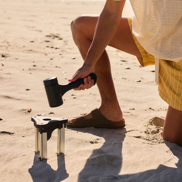 The unique Sand Anchor Kit, featuring an anchor, mallet, sandbag and adjustable lanyards, keeps it secure in any element. A convenient carry bag, 25° tilting canopy, UPF 50+ protection and durable recycled PET fabric deliver stability, sustainability and effortless shade from sunrise to sunset.