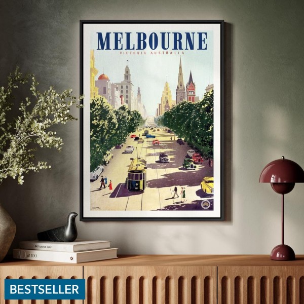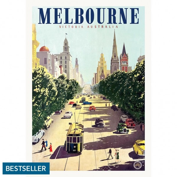 Number 220 in the iconic Victorian Railways poster series, the foreground shows the hustle and bustle of city life including Melbourne's famous W2 Class trams, notable tram number 397 collecting passengers on City Route 47. Tram 397 was built for the Melbourne & Metropolitan Tramways Board by James Moore & Sons in South Melbourne and went into service in 1926. It was finally retired in 1987 after some 60 years of service.