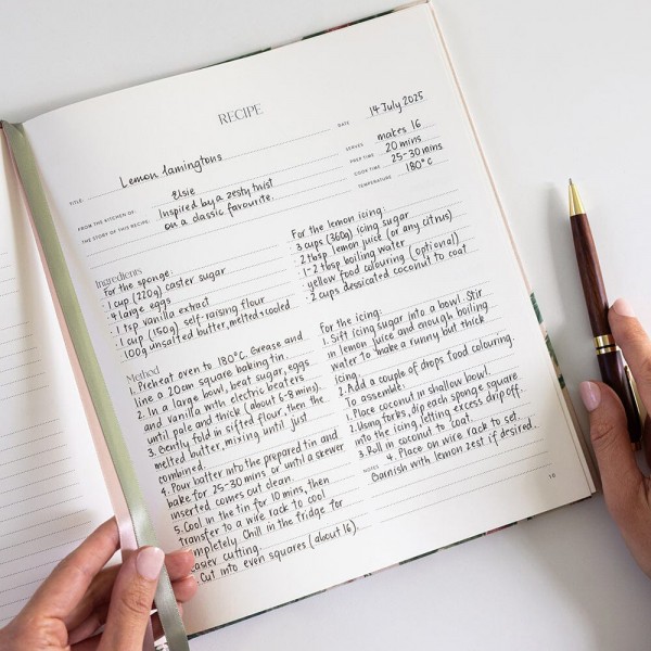 Heirloom Recipe Book with hot foil detail to cover, gold gilded edges, two satin ribbon markers and 100 heavyweight pages.